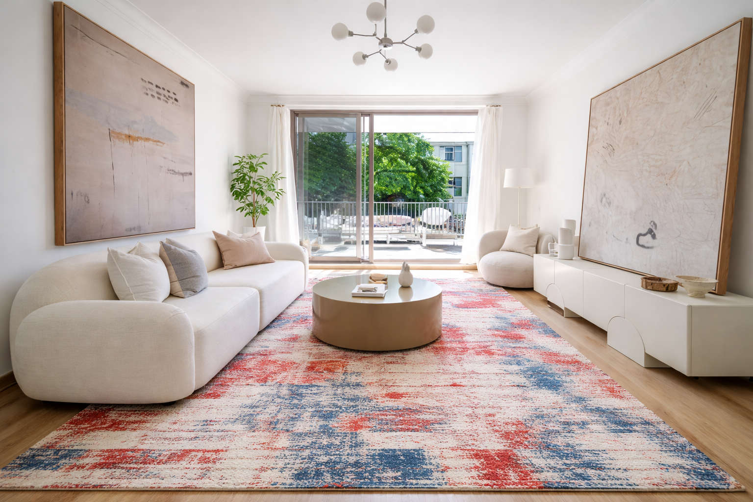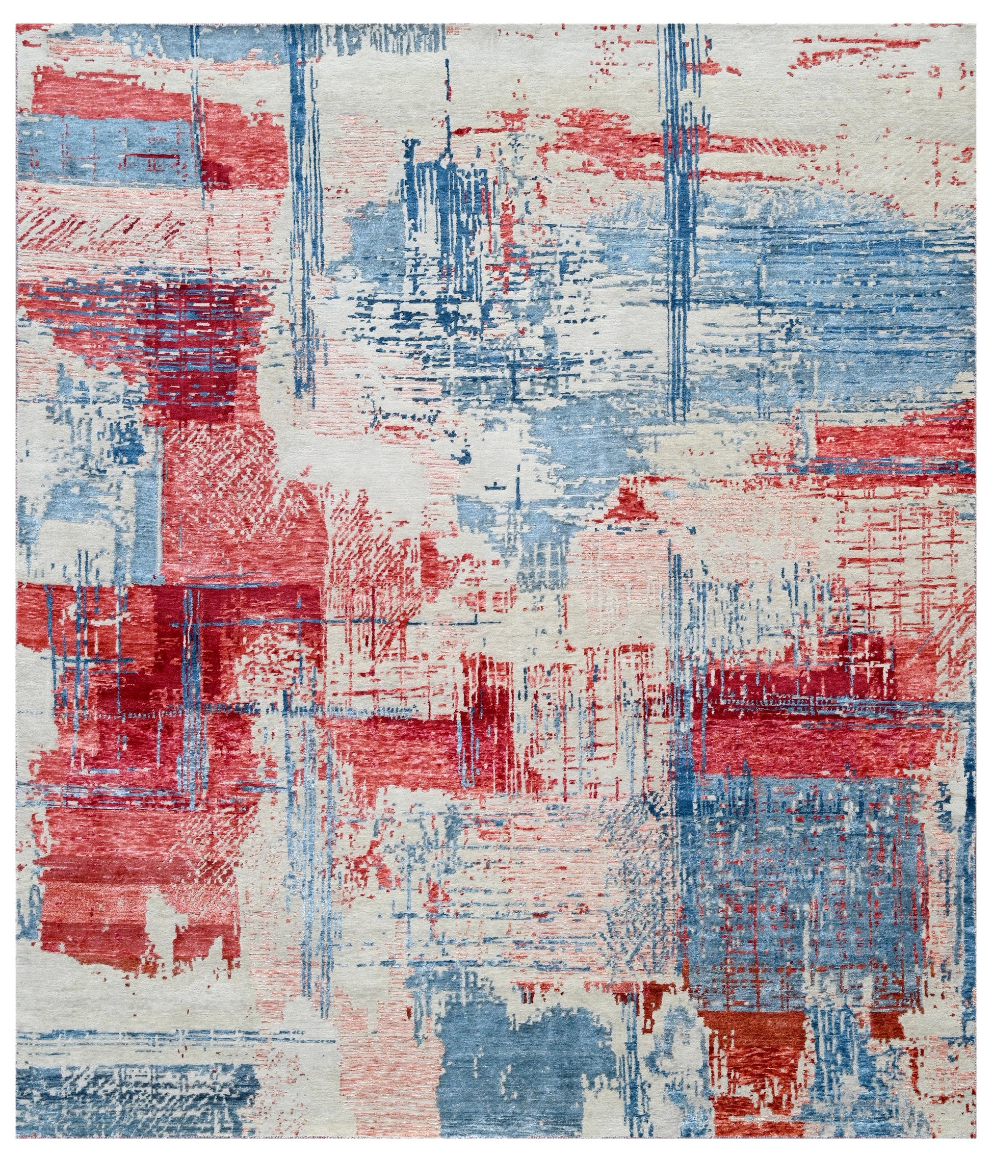 Ember is a bold yet balanced composition of layered colour and texture. Abstract blocks of warm red are interwoven with softened blues and neutral ivory, creating a dynamic surface that feels energetic without overwhelming a space. The design has a painterly, architectural quality, with visible striations and depth that draw the eye in gradually.