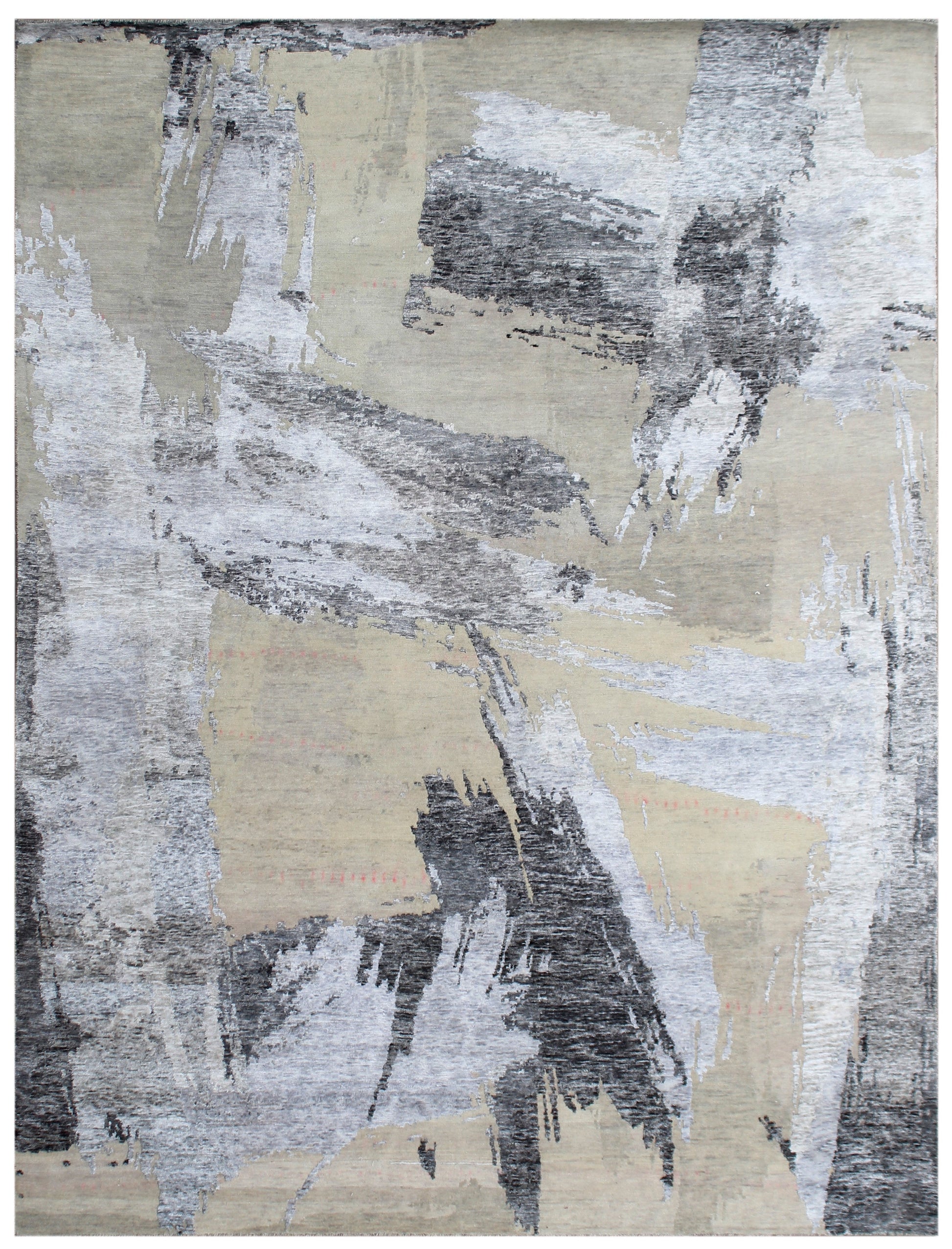 Shore is a refined abstract rug inspired by coastal landscapes and natural erosion. Soft sand and stone-grey tones form a calm foundation, while expressive charcoal and silver brushstrokes move across the surface like waves meeting rock. The subtle sheen of bamboo silk contrasts beautifully with the matte wool, creating depth and texture that shifts gently with the light. Elegant and understated, Shore brings a grounded, architectural calm to contemporary interiors.