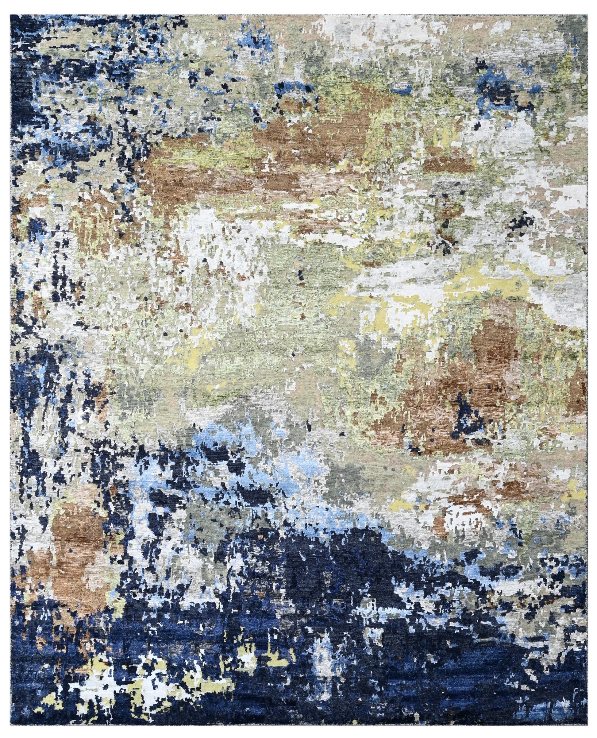 A rich palette of navy, blue, green, and earthy neutrals grounds the design while allowing subtle highlights to emerge through texture and light. The wool and bamboo silk blend enhances this interplay, with matte and lustrous fibres adding dimension and contrast.