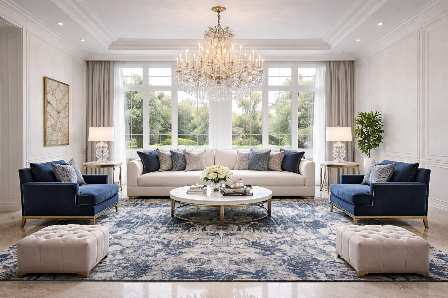 Symmetry explores balance and repetition through a mirrored, abstract composition. Layered textures and softened linear forms create visual depth, while the interplay of light and shadow gives the rug a calm, architectural presence. The palette remains composed and versatile, allowing the pattern to anchor a space without overwhelming it.