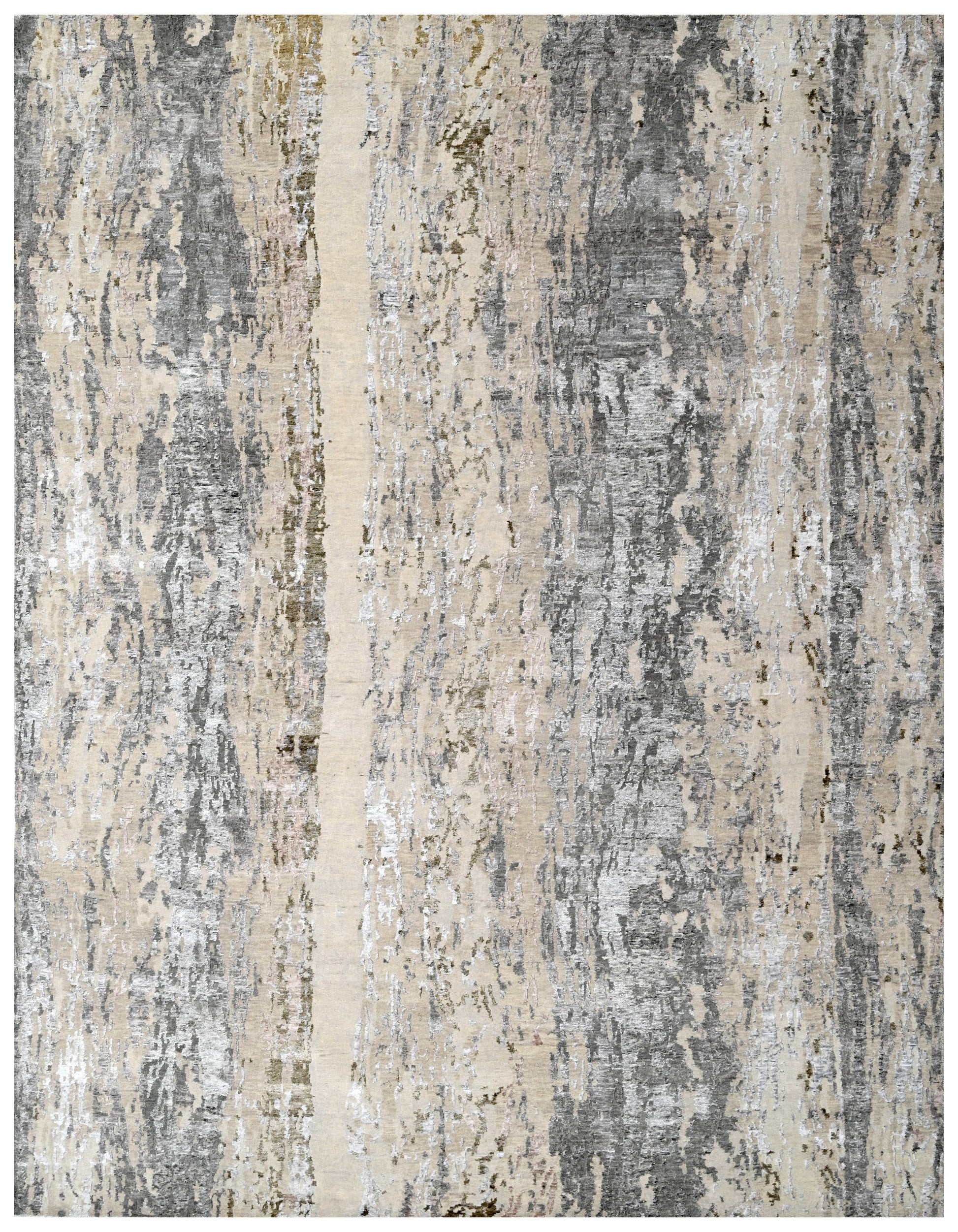 Zenith features a vertically layered composition with softly distressed bands that create rhythm and depth without overwhelming the space. The tonal interplay of warm beige, muted greys and subtle metallic highlights gives the design a refined, architectural feel.