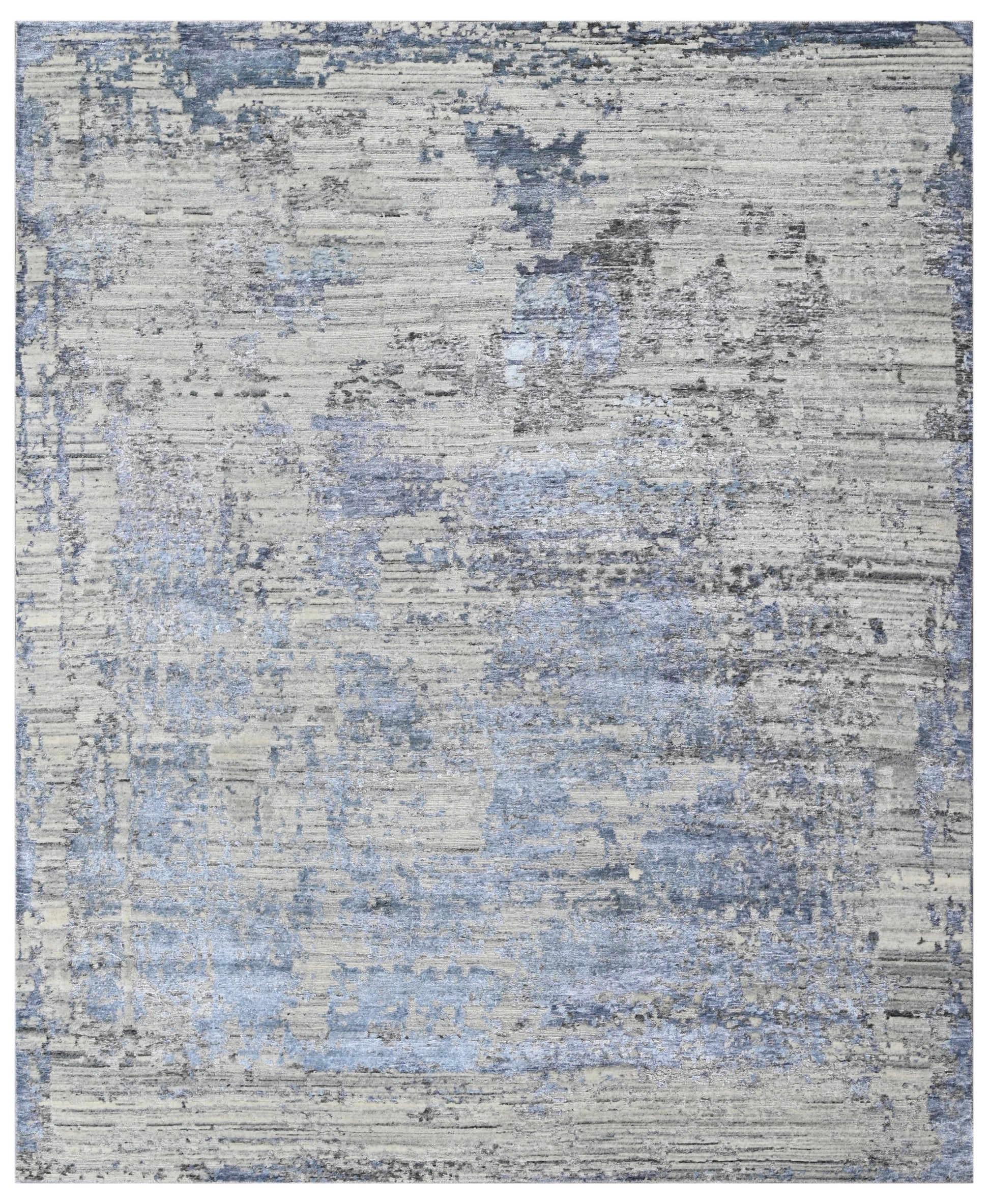 Haze is designed for light, contemporary interiors where subtle colour and texture create a calming atmosphere. Soft washes of blue drift across a layered base of stone and grey, forming an abstract composition reminiscent of fading skies and morning light. Hand-knotted from a refined blend of bamboo silk and wool, the rug carries a gentle sheen and finely striated texture that adds depth without visual heaviness. Understated yet expressive, Haze provides a serene foundation for both residential and commercial spaces.