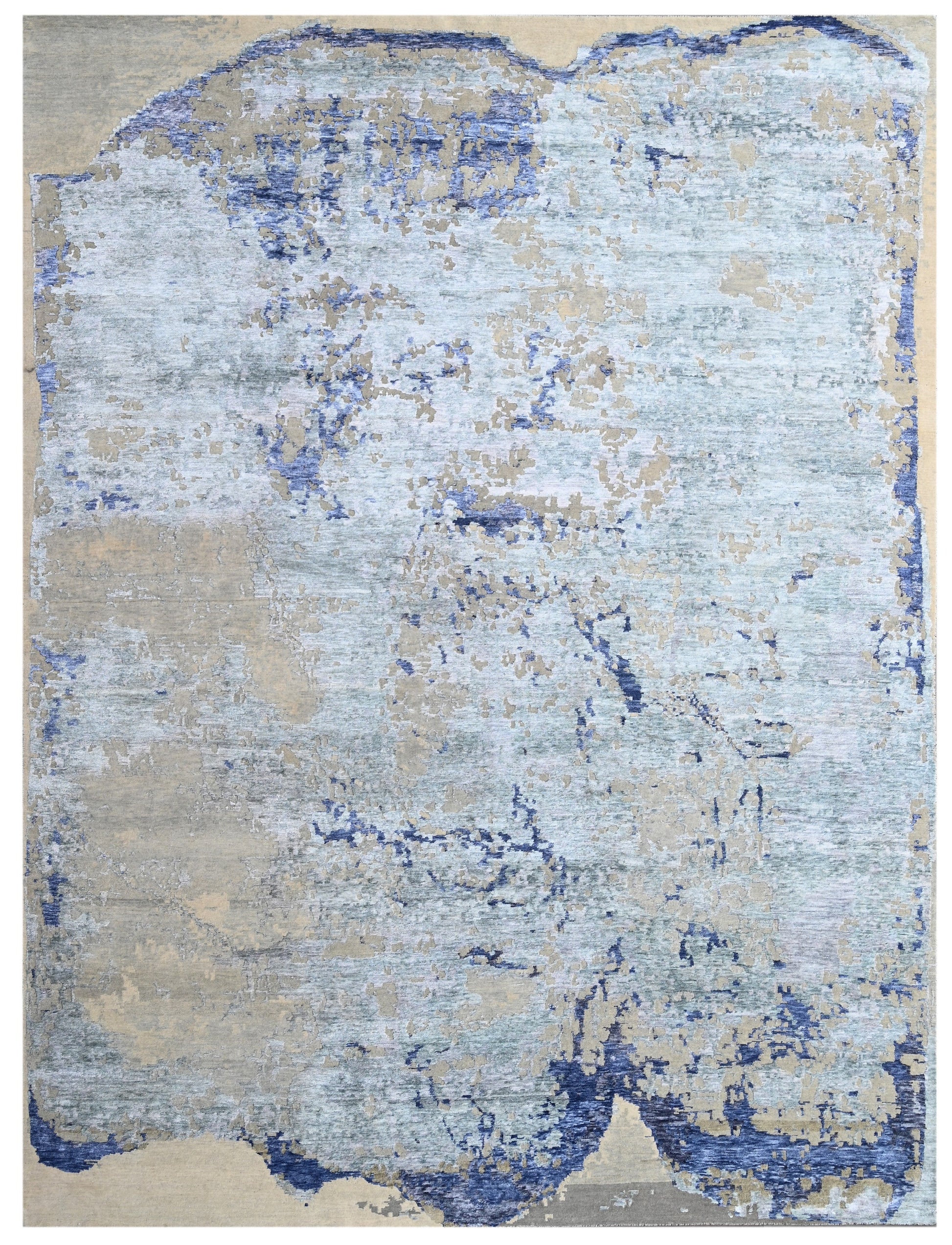 Tidewash features a softly layered composition of pale silver, washed aqua, and mineral blue, evoking the movement of water across stone. The abstract pattern flows organically across the surface, with gentle tonal shifts and a subtle sheen that adds depth without overwhelming the space. Hand-knotted from a refined blend of wool and bamboo silk, this rug brings quiet movement and a serene presence to modern residential and commercial interiors.
